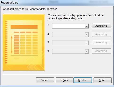 | Hộp hội thoại Report Wizard/ Chọn trường sắp xếp |