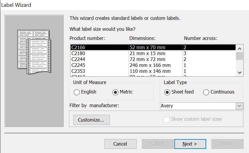 | Hộp hội thoại Label Wizard/ Chọn kích thước |